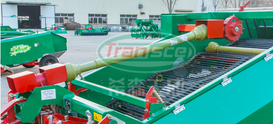 7、尾篩:經過輸送分離篩和薯秧分離機構傳過來的馬鈴薯落到尾篩上,通過逆向運行,比重輕的雜草被送到上方掉到秧蔓側輸出帶上,輸送到側方,比重大的馬鈴薯通過集薯整形鋪放裝置有規律地鋪放到地面上。